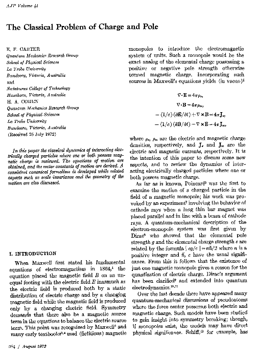 The Classical Problem of Charge and Pole, American Journal of Physics, Vol 41, Issue 8, Aug 1973, pp 944-950.